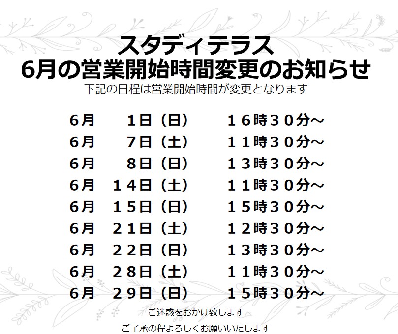 自習室スタディテラスの6月の営業時間変更のお知らせです。