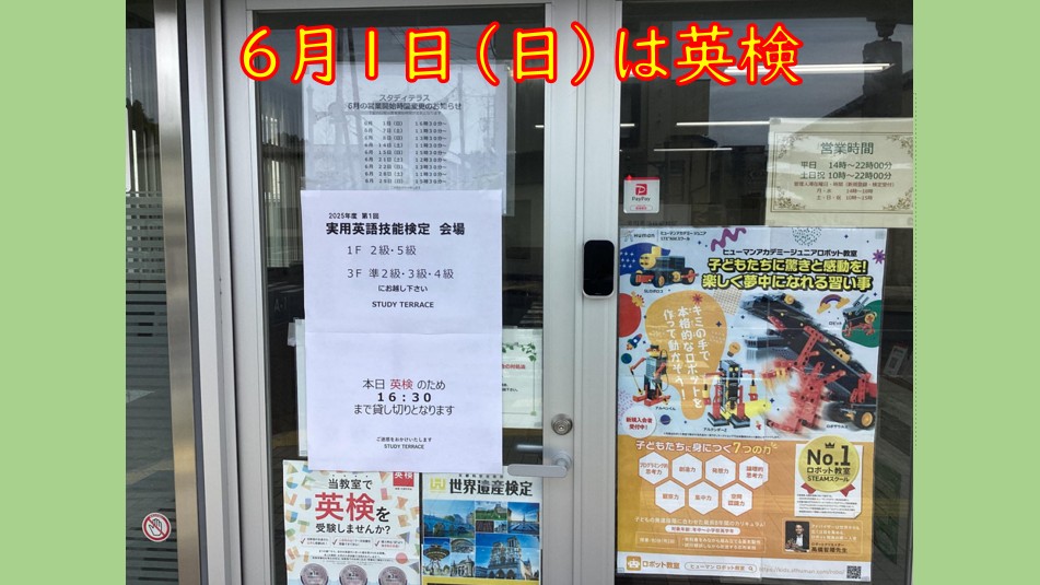 6月1日(日)は実用英語技能検定のためスタディテラスは16時30分まで貸しきりとなります。