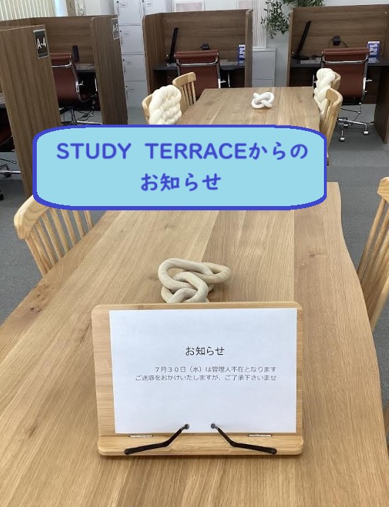 自習室スタディテラスのお知らせです。 7月30日(水)は管理人不在となります。 ご迷惑をおかけいたしますがご了承のほどよろしくお願い申し上げます🙇♀️