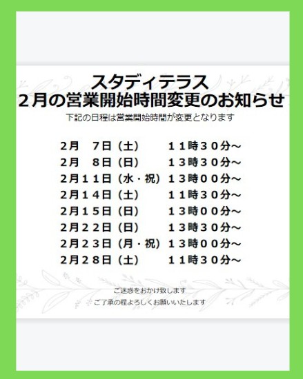 自習室スタディテラスの12月の営業時間変更のお知らせです。