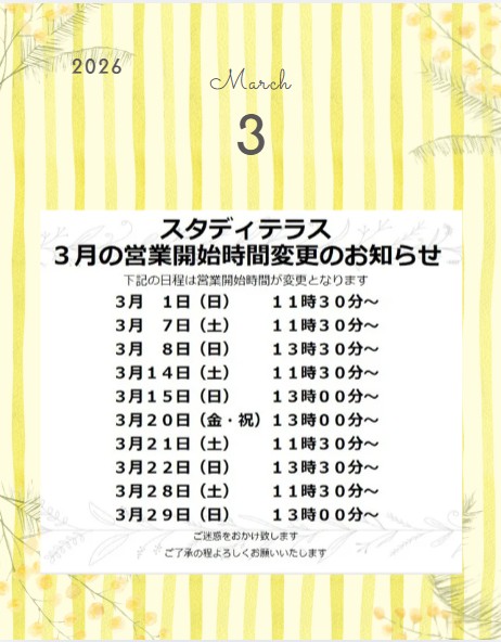 自習室スタディテラスの3月の営業時間変更のお知らせです。