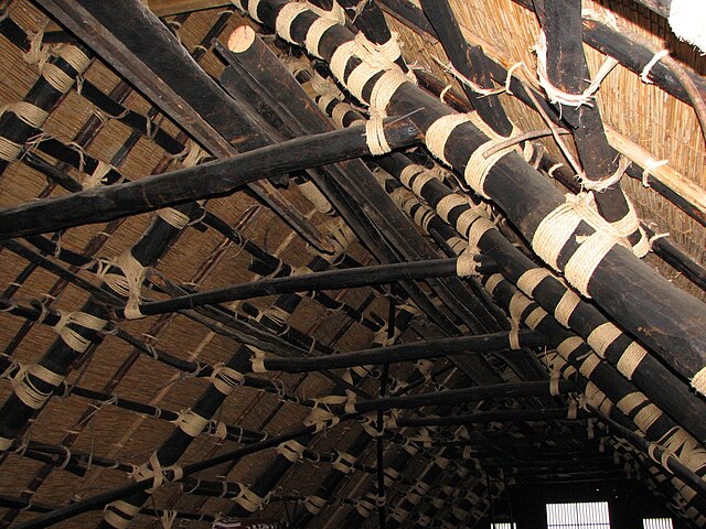 合掌造りの屋根組みは釘は1本も使わず、上部な縄で固定します。これは、雪の重さや風の強さに対する柔軟性を生み、家の耐久性を増す工夫であると言われています。