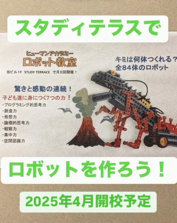 来年の2025年のスタディテラスは、春、ヒューマンアカデミー主催のロボット教室を開校予定です。