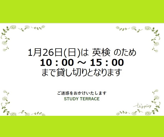 1月26日(日)は実用英語技能検定のためスタディテラスは15時まで貸しきりとなります。