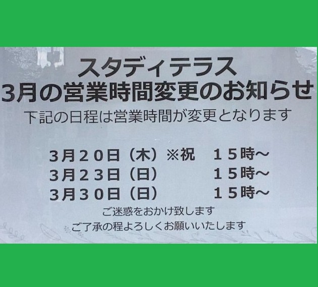 自習室スタディテラスの3月の営業時間変更のお知らせです。
