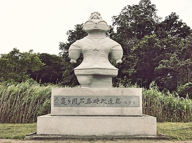 津軽平野南西部の丘陵先端部に位置し、遮光器土偶を模ったモニュメント背後の湿地帯からは数多くの遺物が出土しています。